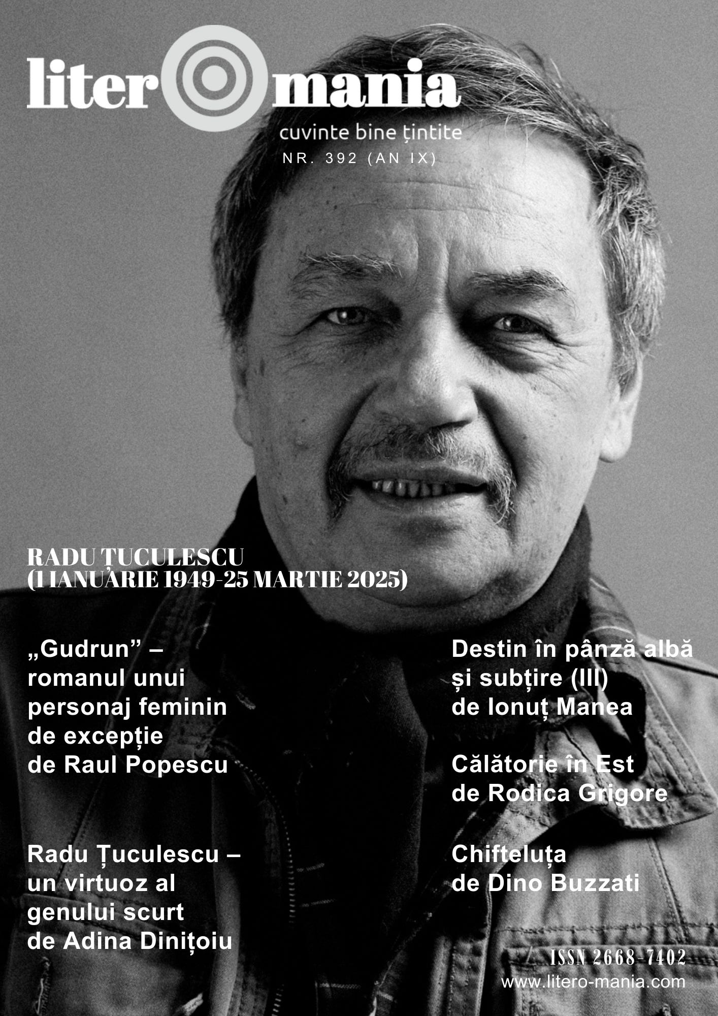 Primul număr pe 2026 al Literomaniei (numărul 392) este online și vă propune - în semn de omagiu pentru scriitorul (și prietenul) Radu Țuculescu, născut la 1 ianuarie 1949 și plecat dintre noi prea devreme, pe 25 martie 2025 - un mic grupaj de texte: o cronică semnată de Raul Popescu la ultimul său roman, „Gudrun. O crimă anunțată” (Polirom, 2025) și postfața semnată de Adina Dinițoiu la volumul „Uscătoria de partid (blitz-proze)” (Editura Şcoala Ardeleană, 2019), volum ce conține proze publicate în serial pe Literomania. Puteți citi, de asemenea, partea a treia a nuvelei inedite „Destin în pânză albă și subțire” de Ionuț Manea; cronică de carte de Rodica Grigore („Nepoata” de Bernhard Schlink, trad. Mariana Bărbulescu, Polirom, 2024); proza scurtă „Chifteluța” de Dino Buzzati, în traducerea lui Dominique Ilea; proză flash fiction semnată de Eduard-Gabriel Tănase și Florin Oncescu; poeme de Timeea Ivan la poșta redacției; un articol în spaniolă de Washington Daniel Gorosito Pérez, precum și rubricile „Pastila de înțelepciune” și „Pucă show” (de anticarul nostru Bozz). Vă dorim lectură plăcută și un An Nou spornic și liniștit, cu multe cărți bune!