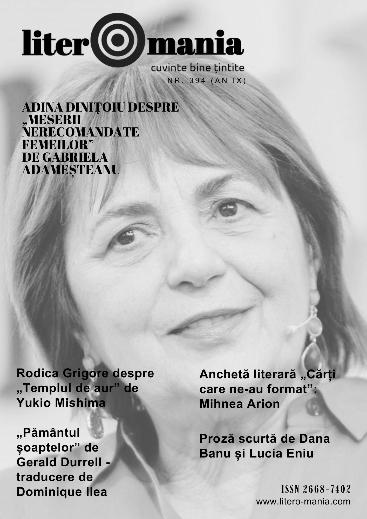 Literomania nr. 394 este online și vă propune la „Cartea săptămânii” volumul de memorialistică „Meserii nerecomandate femeilor” de Gabriela Adameșteanu, apărut la sfârșitul lui 2025 la Editura Polirom, și lansat la Târgul de carte Gaudeamus. Volumul Gabrielei Adameșteanu este o apariție-eveniment nu numai a Târgului de carte Gaudeamus, ci și a acestui început de nou an cultural - cronică semnată de Adina Dinițoiu. Puteți citi, de asemenea, în sumar: noi răspunsuri la ancheta noastră literară „Cărți care ne-au format”, semnate de Mihnea Arion; cronică de carte de Rodica Grigore (Yukio Mishima, „Templul de aur”); traduceri de Dominique Ilea (capitolul al doilea din „Pământul șoaptelor”/ „The Whispering Land” de Gerald Durrell); o avanpremieră (în engleză) din volumul „Around the World in Fifty Books” de Rodica Grigore (trad. Mirela Petrașcu, Cambridge Scholars Publishing, 2026); un mic eseu (în spaniolă) de Washington Daniel Gorosito Pérez; proză scurtă semnată de Dana Banu și Lucia Eniu, precum și rubricile „Anticariat” de Bozz (cu un fragment din eseul „Noua structură și opera lui Marcel Proust” de Camil Petrescu), „Pastila de înțelepciune” și „Pucă show” (rubrică ajunsă la #96). Lectură plăcută!